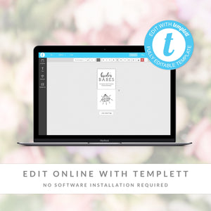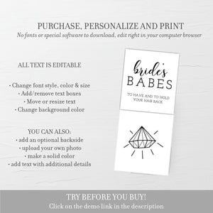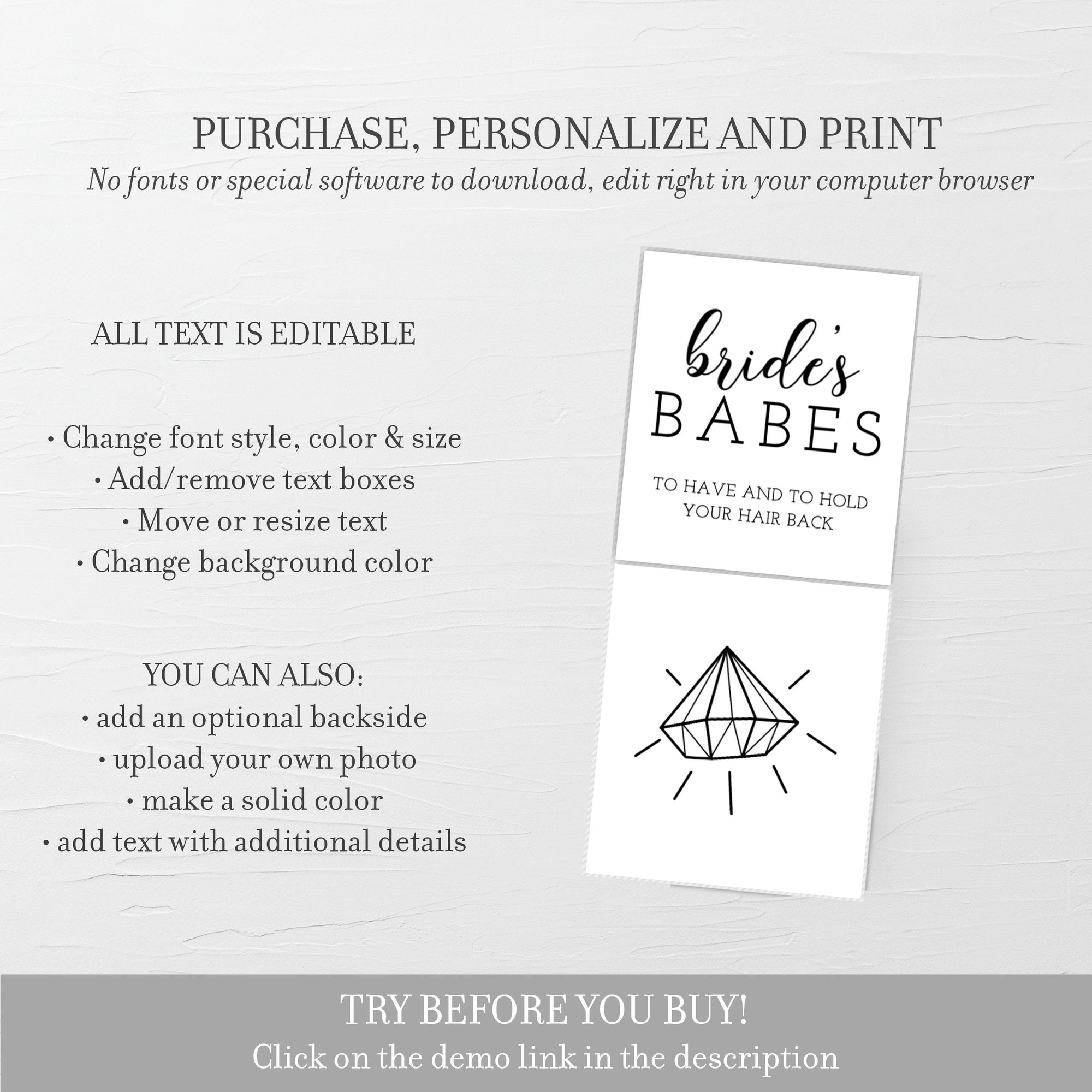 These bride's babes cards for hair scrunchies are available as an INSTANT DOWNLOAD editable template. Edit right in your browser using the online program, Templett. No software to download or fonts to install and you can even try it out before you buy!