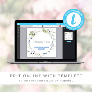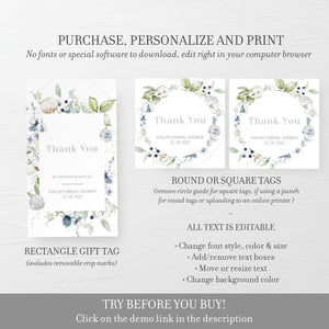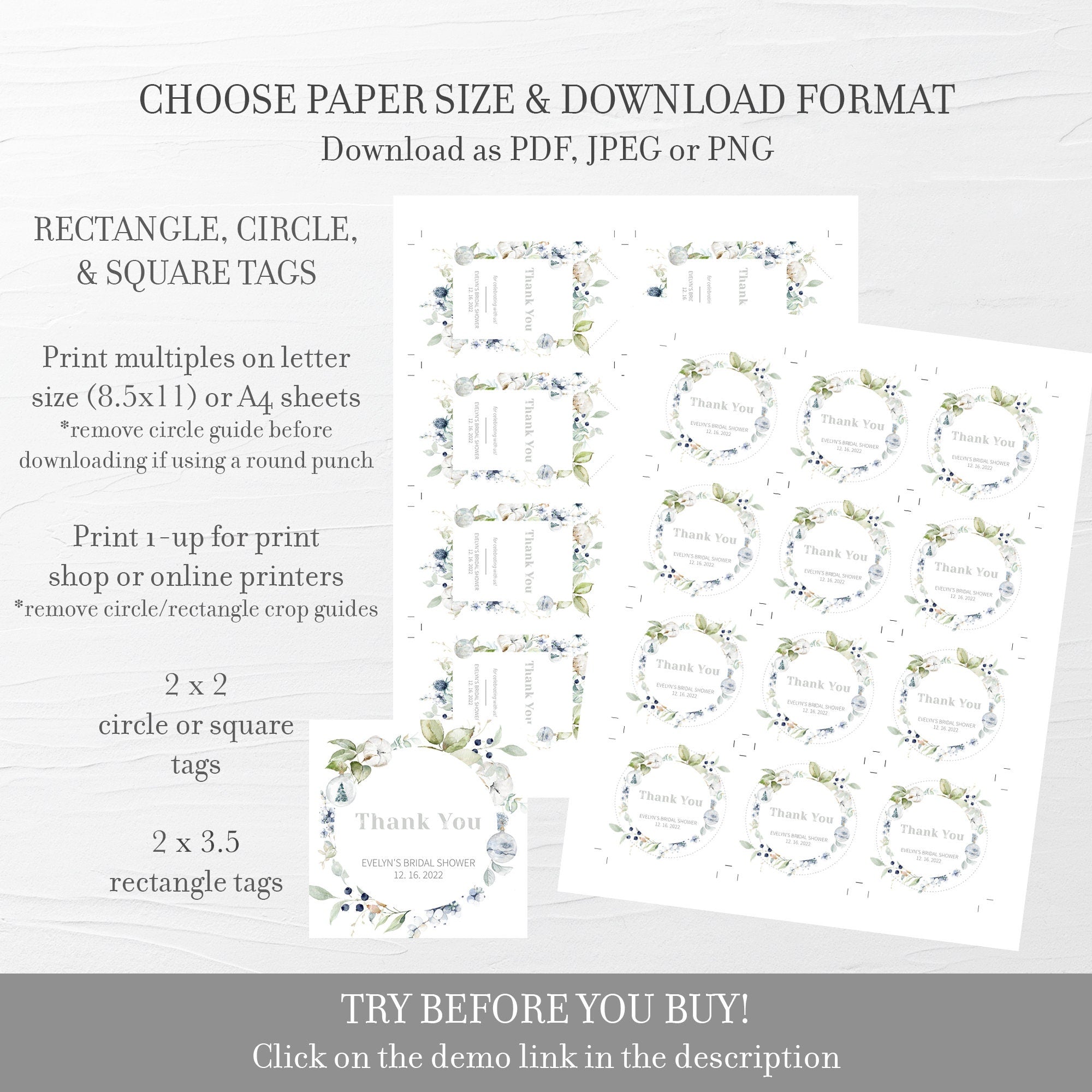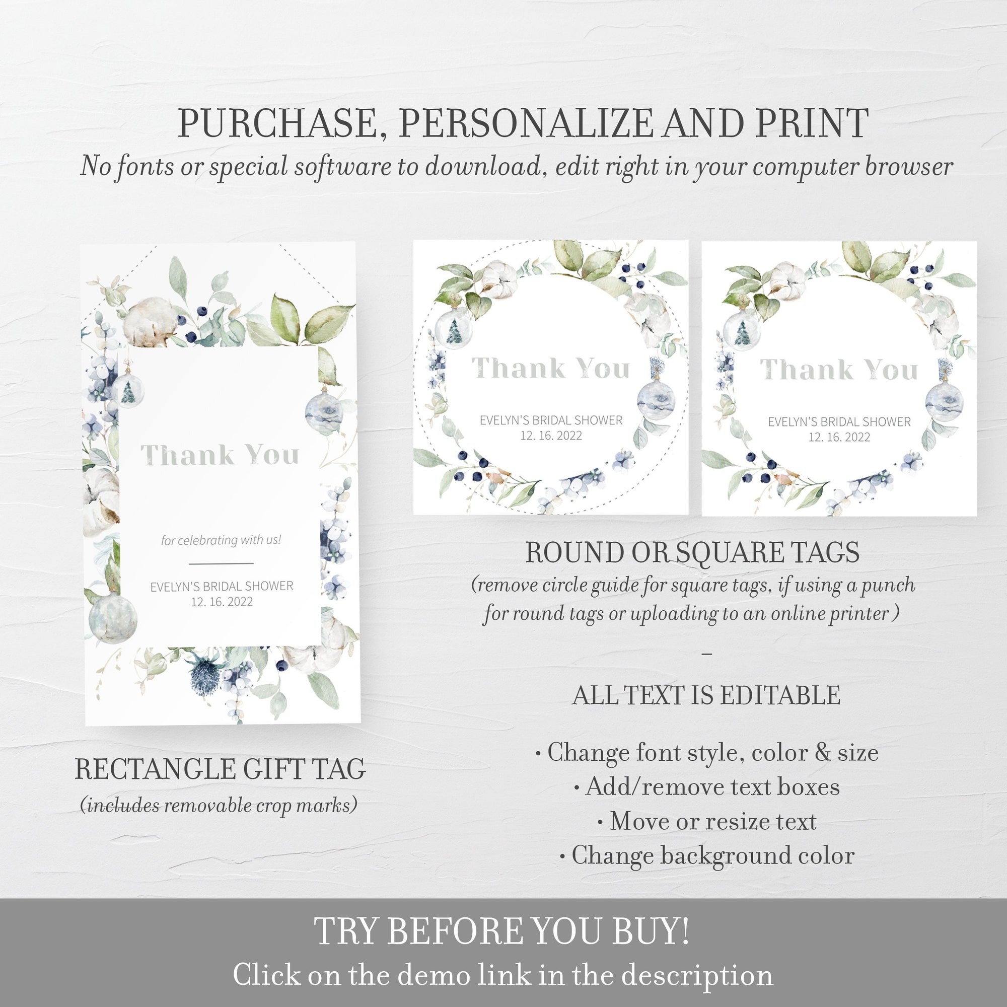 These winter bridal shower favor tags are available as an INSTANT DOWNLOAD editable template. Edit right in your browser using the online program, Templett. No software to download or fonts to install and you can even try it out before you buy!