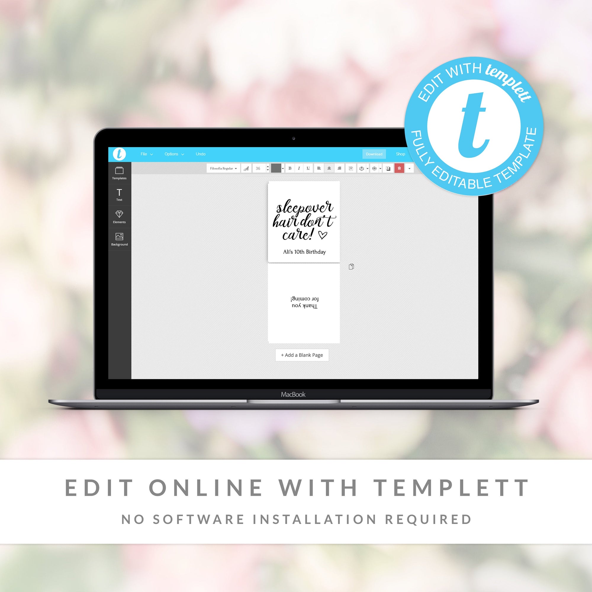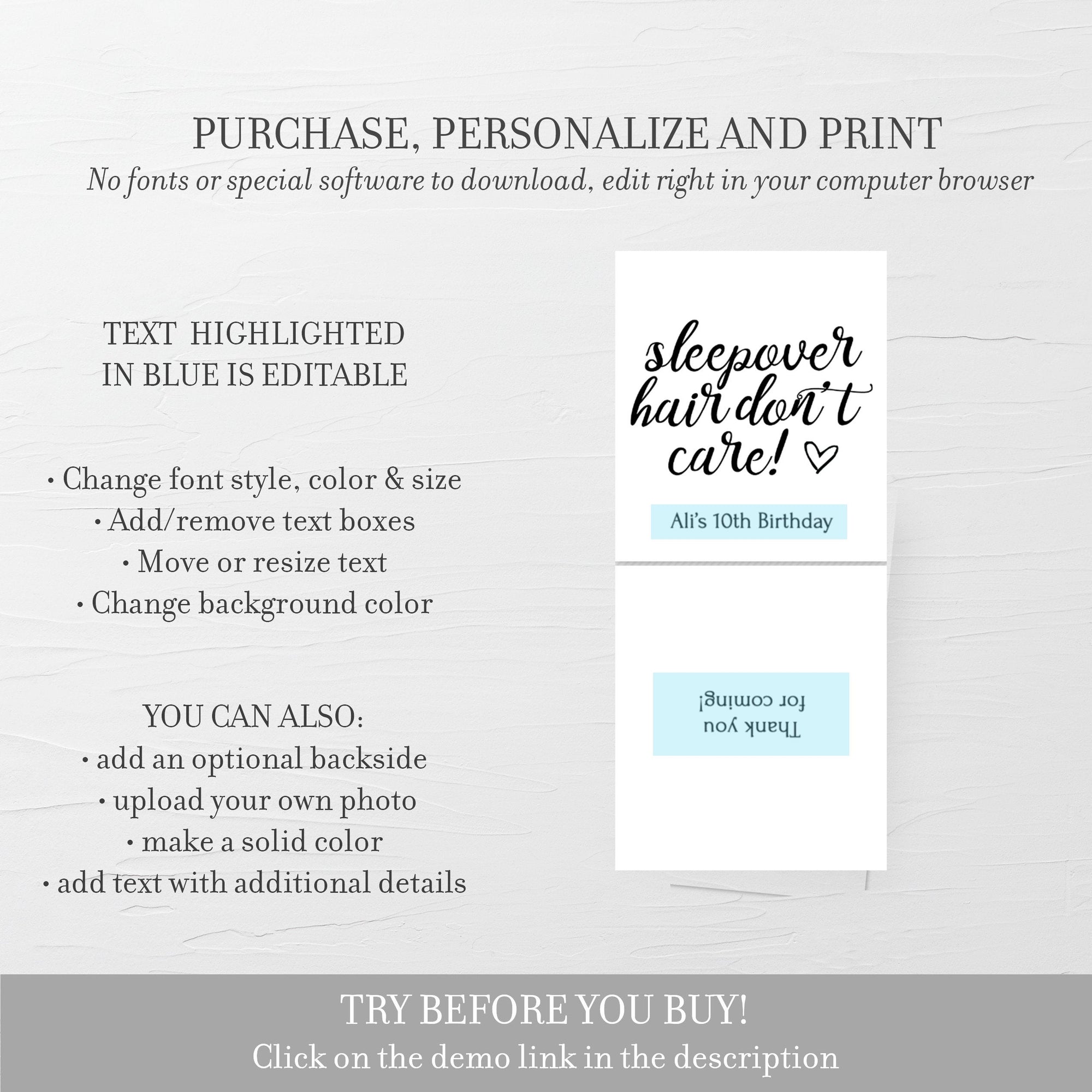 These sleepover favor cards for hair scrunchies are available as an INSTANT DOWNLOAD editable template. Edit right in your browser using the online program, Templett. No software to download or fonts to install and you can even try it out before you buy!