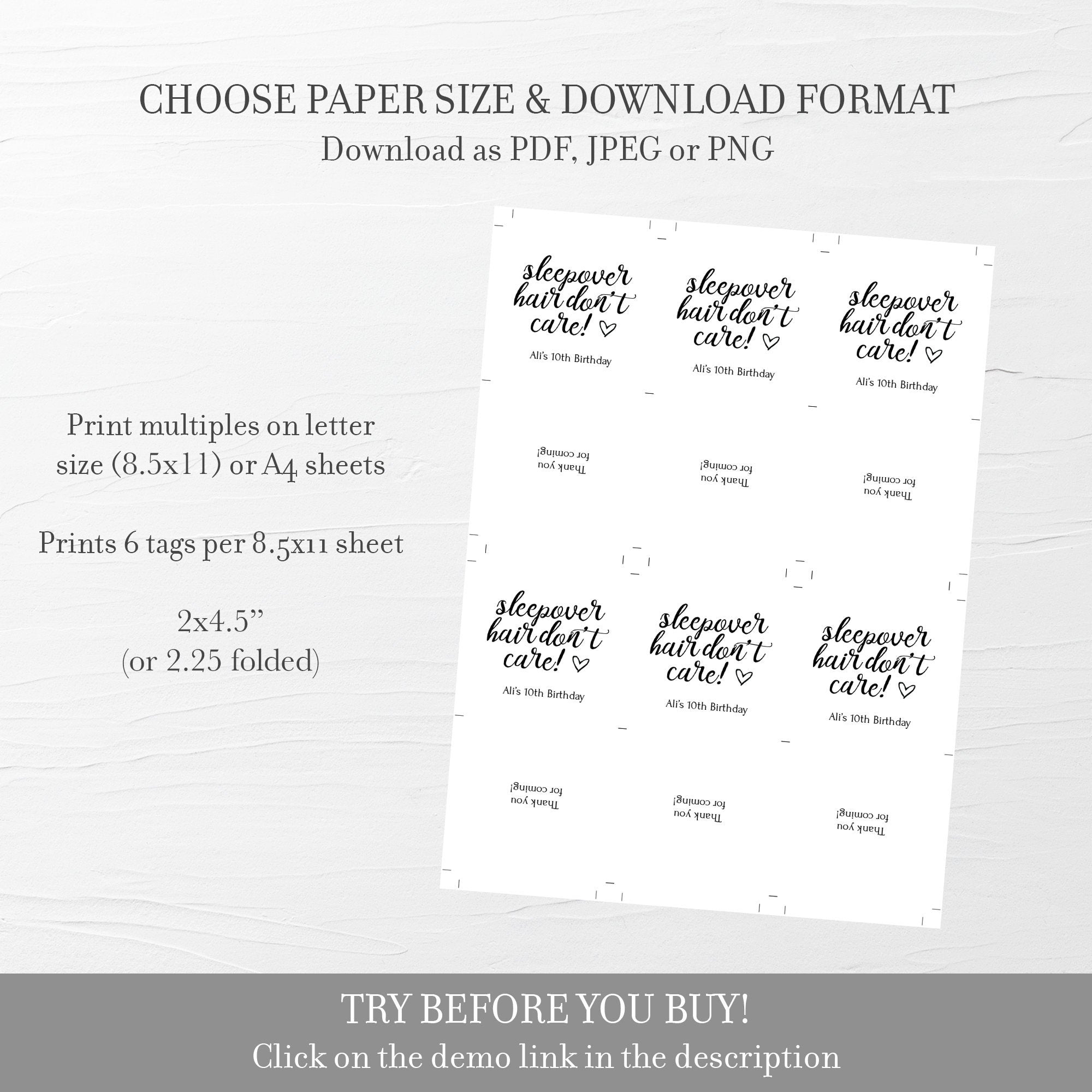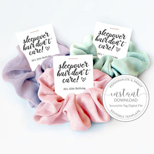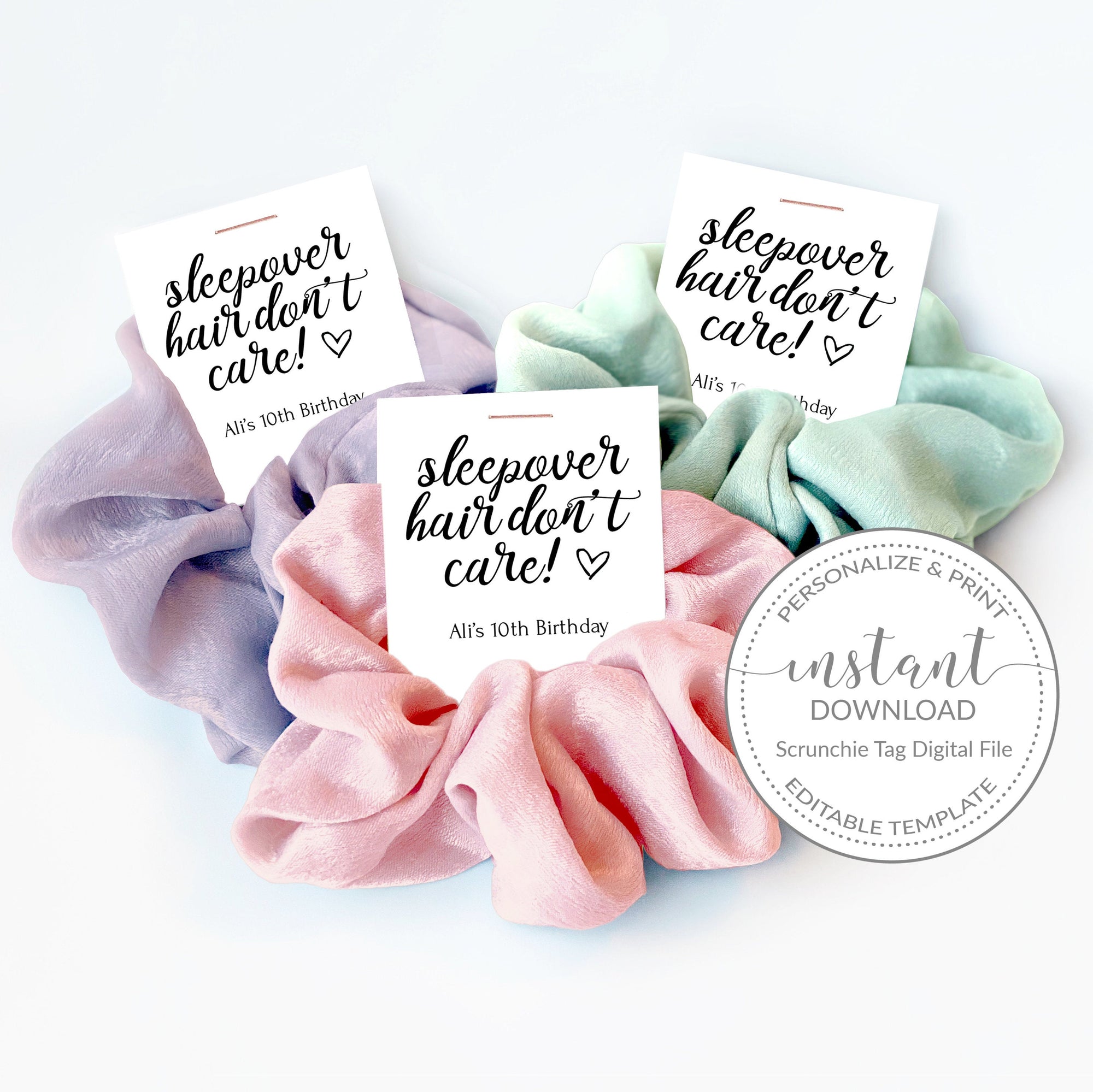 Sleepover Favor Tag Template for Hair Scrunchies, Printable Sleepover Party Favors Tag, Editable INSTANT DOWNLOAD