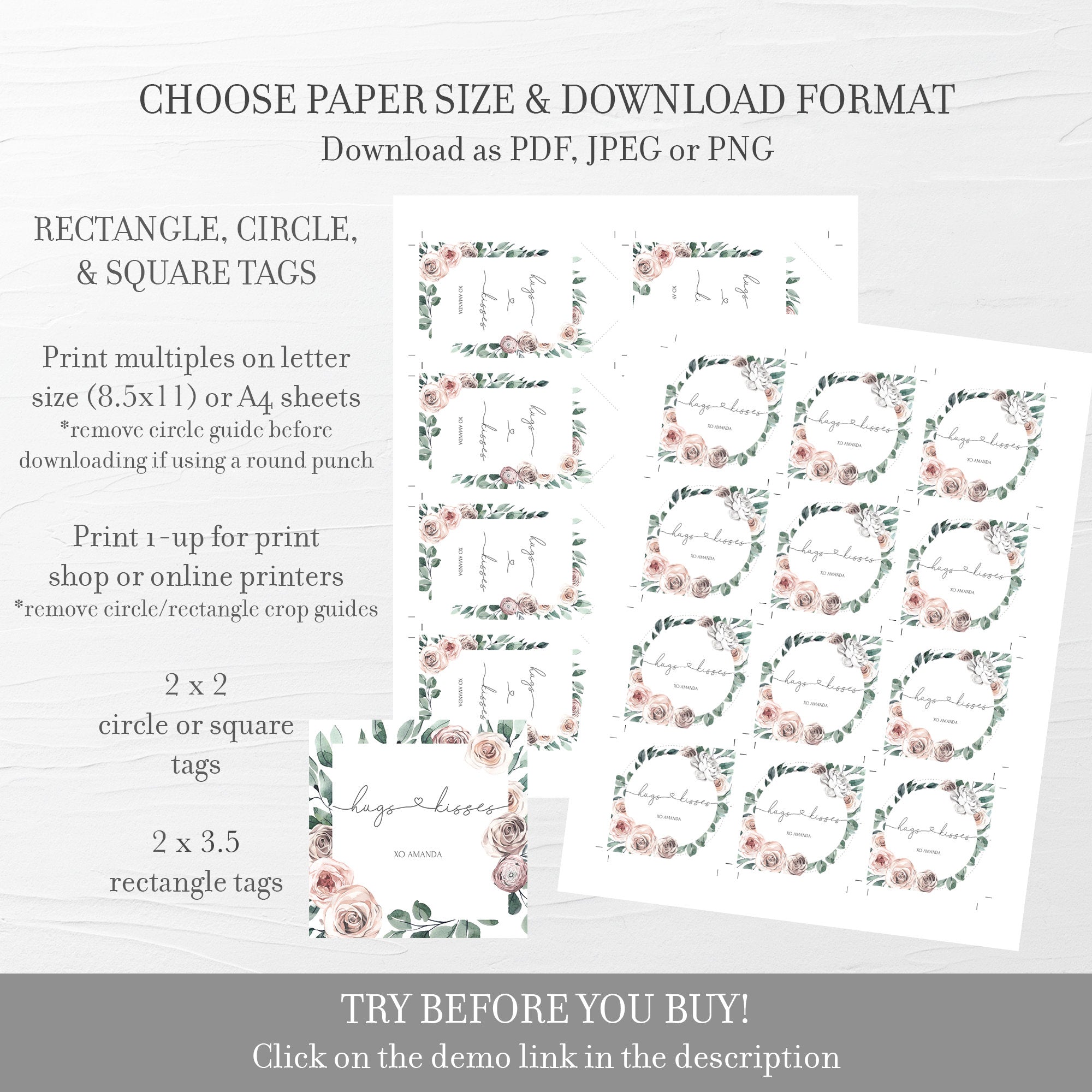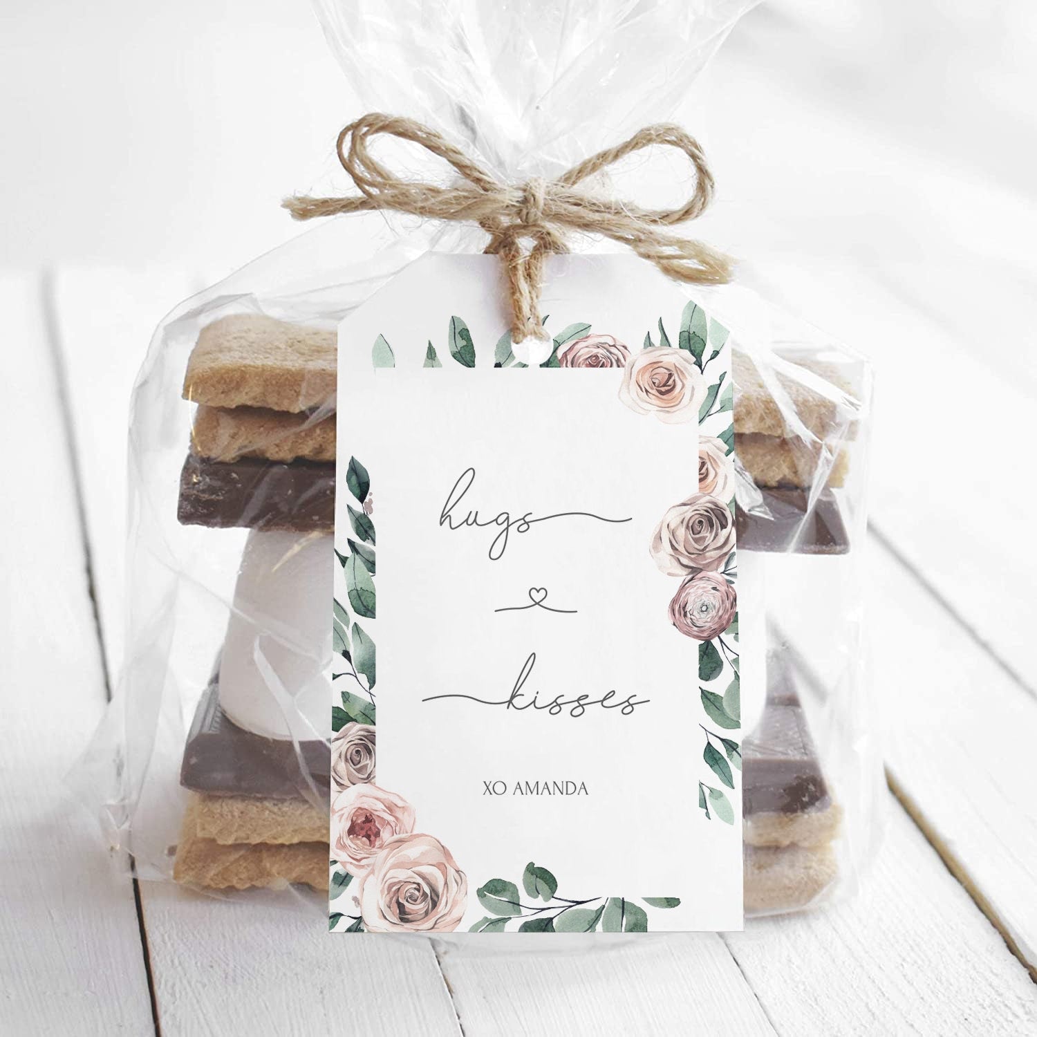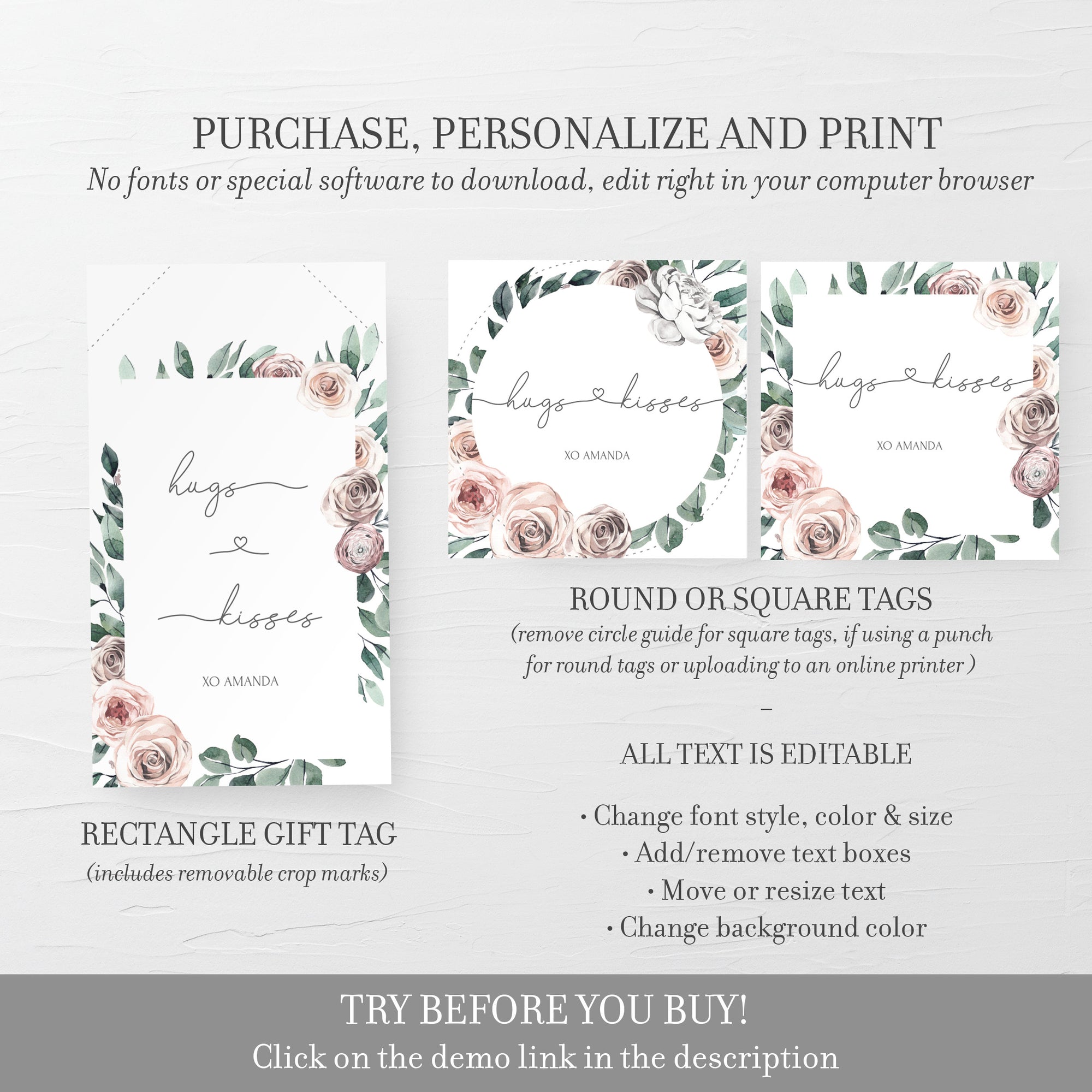 Boho Rose Hugs and Kisses Gift Tags, Printable Valentines Day Favor Tags, Editable INSTANT DOWNLOAD - BR100