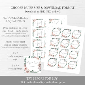 These floral favor tags are available as an INSTANT DOWNLOAD editable template. Edit right in your browser using the online program, Templett. No software to download or fonts to install and you can even try it out before you buy!