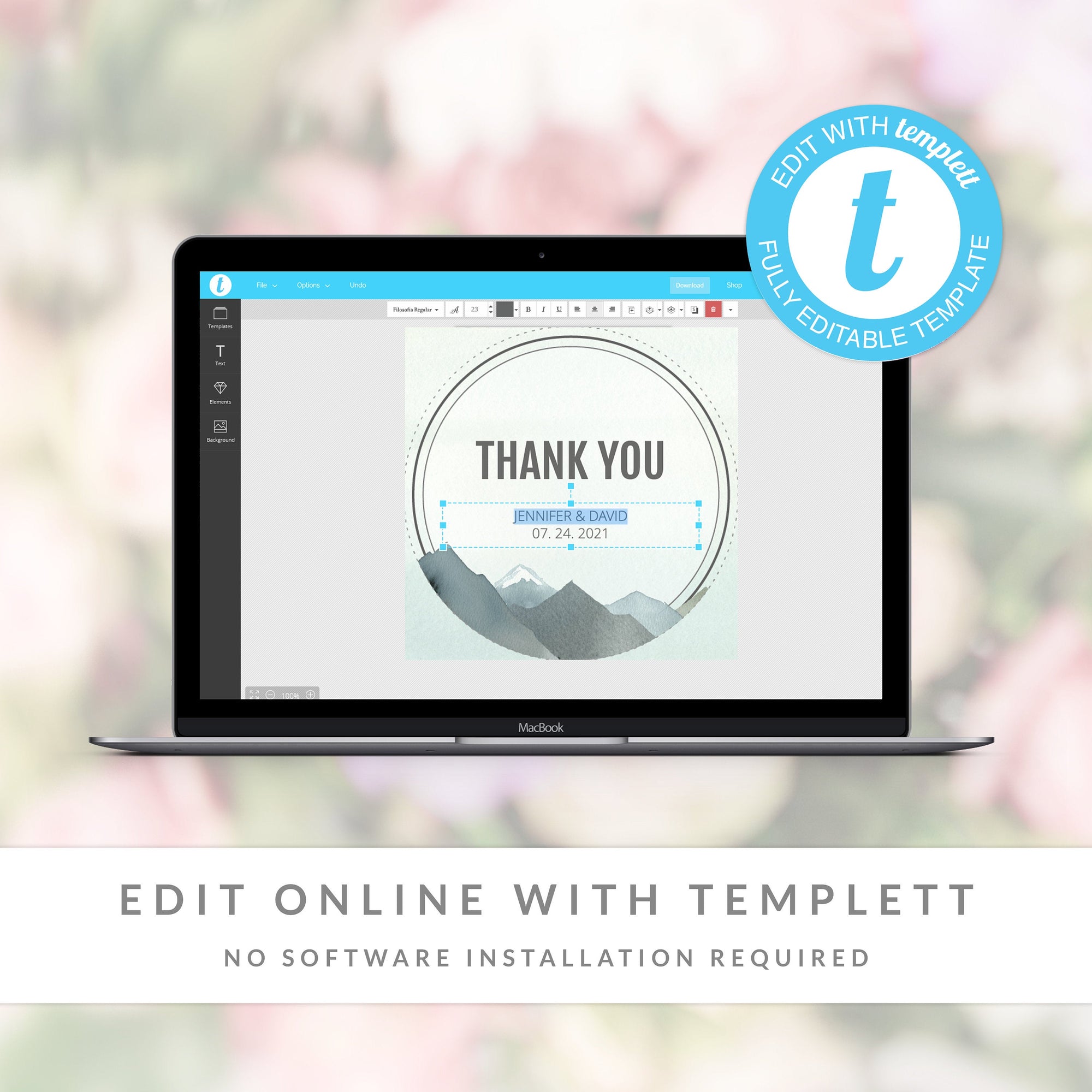 These mountain wedding stickers are available as an INSTANT DOWNLOAD editable template. Edit right in your browser using the online program, Templett. No software to download or fonts to install and you can even try it out before you buy!