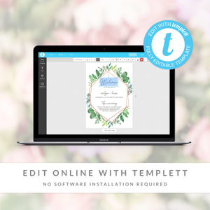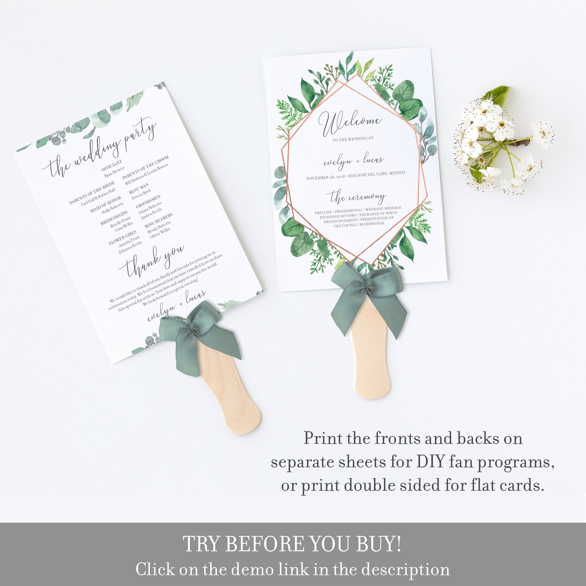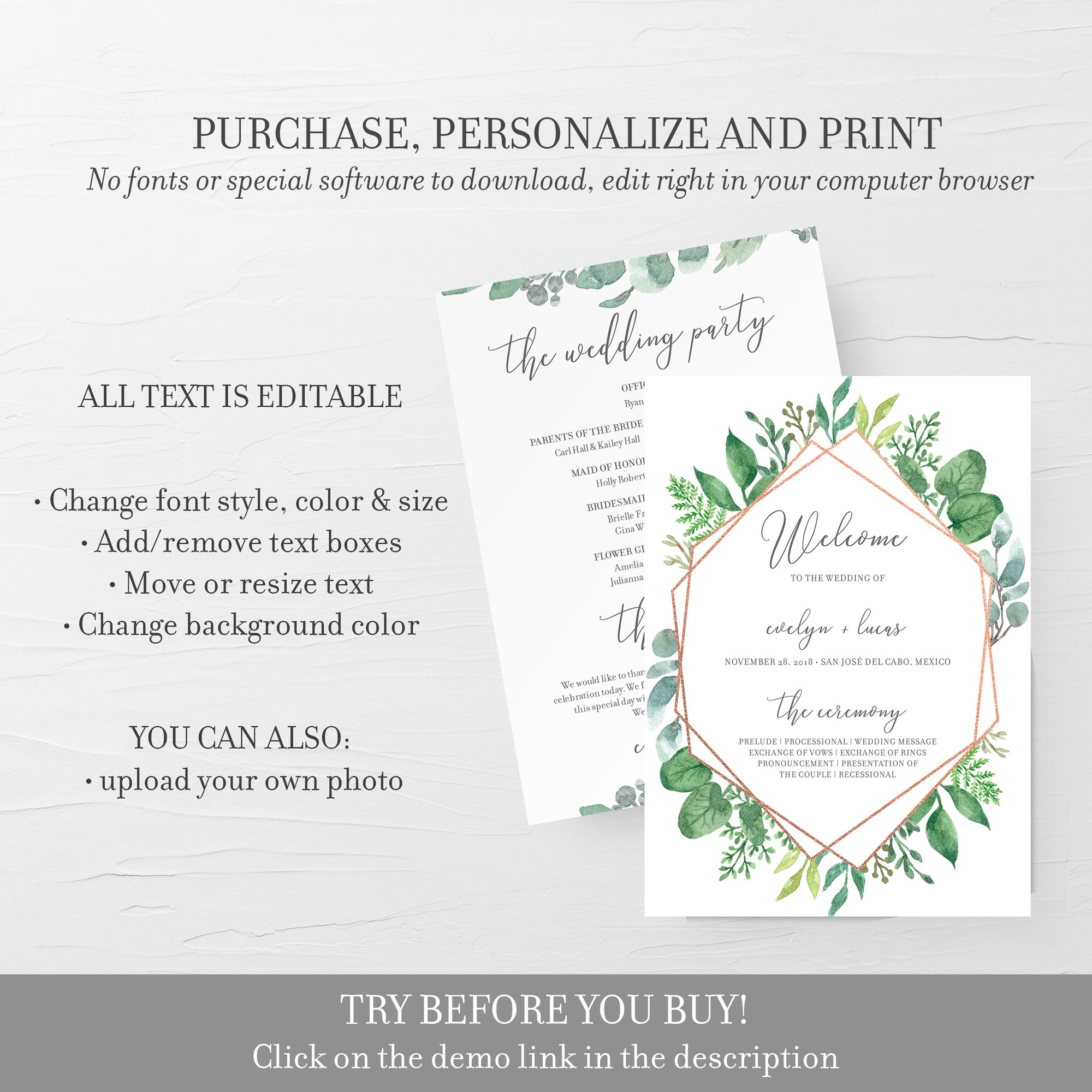 This rose gold geometric greenery 2-sided program is available as an INSTANT DOWNLOAD editable template. Edit right in your browser using the online program, Templett. No software to download or fonts to install and you can even try it out before you buy!
