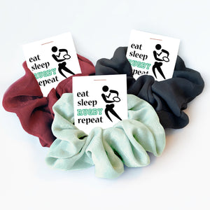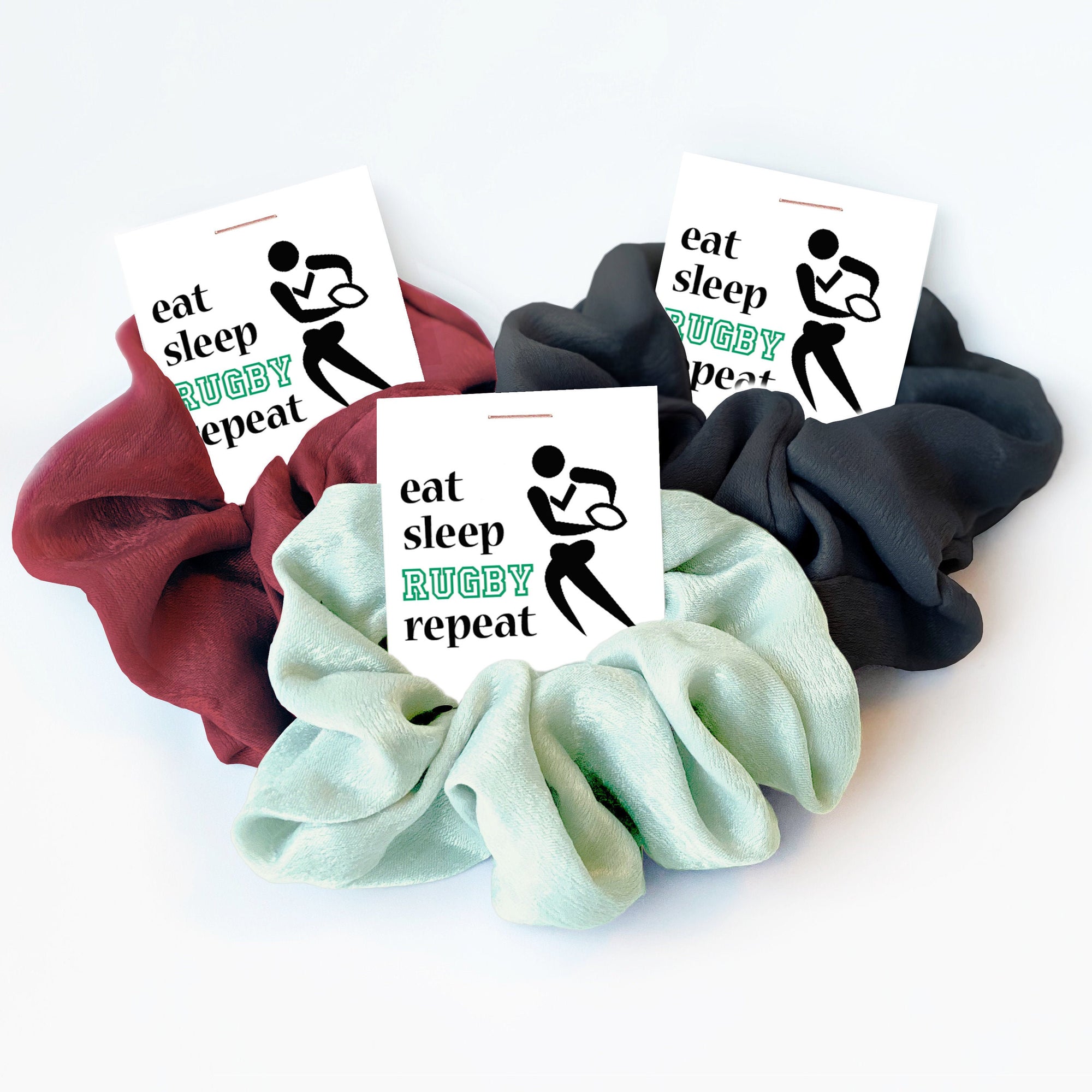 The tags come with the following message: "Eat Sleep Rugby Repeat". If you would like to add a line of personalized text below (for orders of 5+ scrunchies), write it in the notes at checkout.