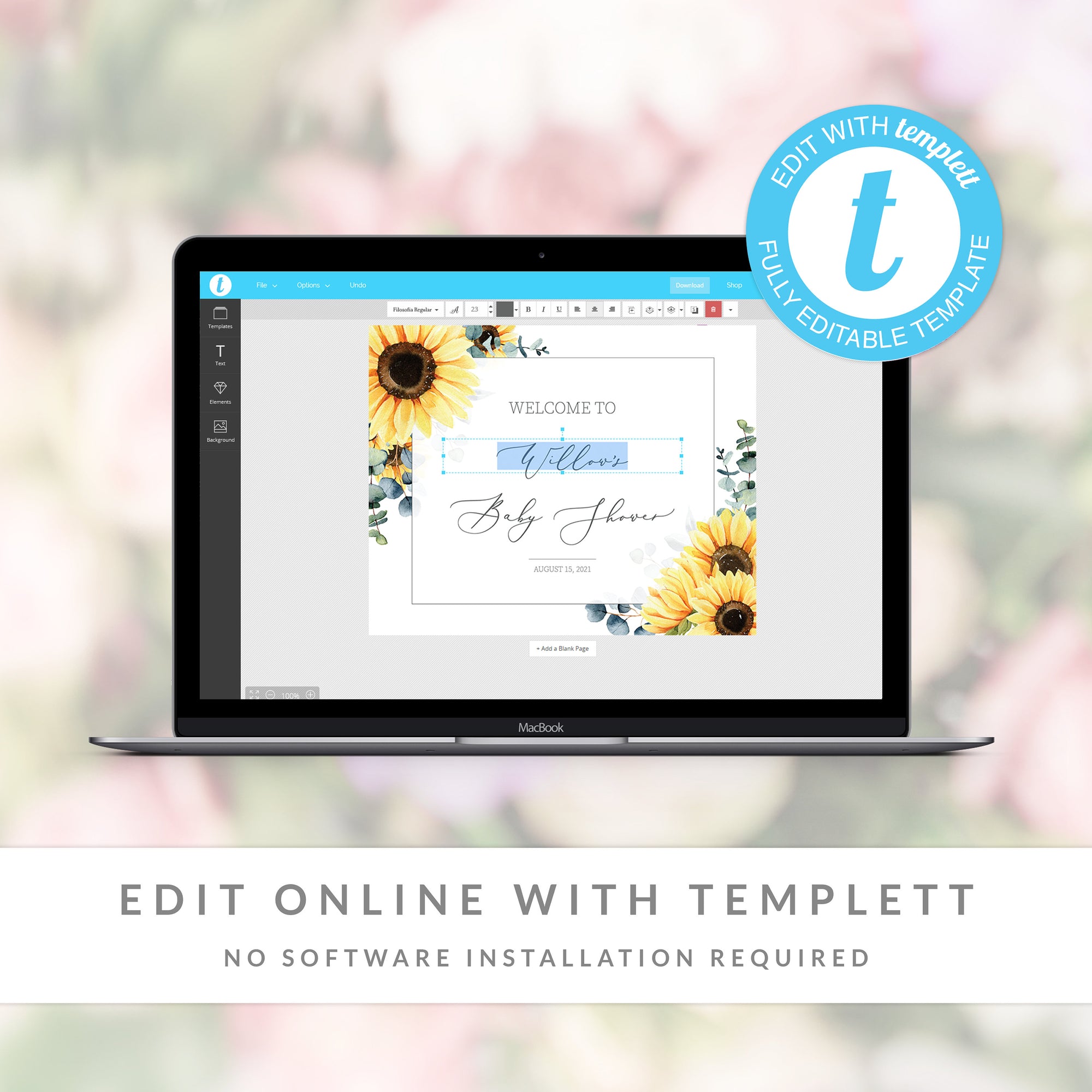 This sunflower wedding welcome sign is available as an INSTANT DOWNLOAD editable template. Edit right in your browser using the online program, Templett. No software to download or fonts to install and you can even try it out before you buy!