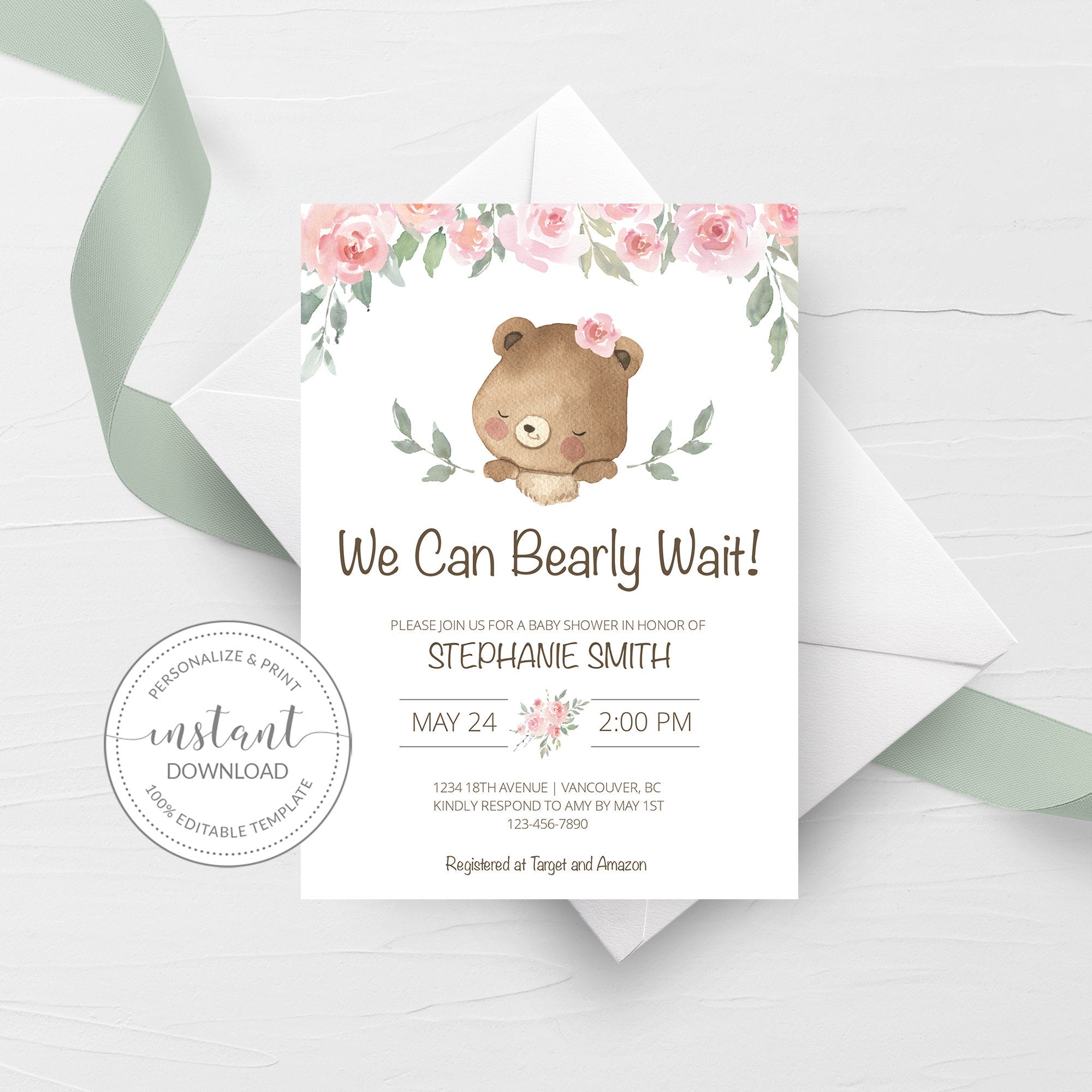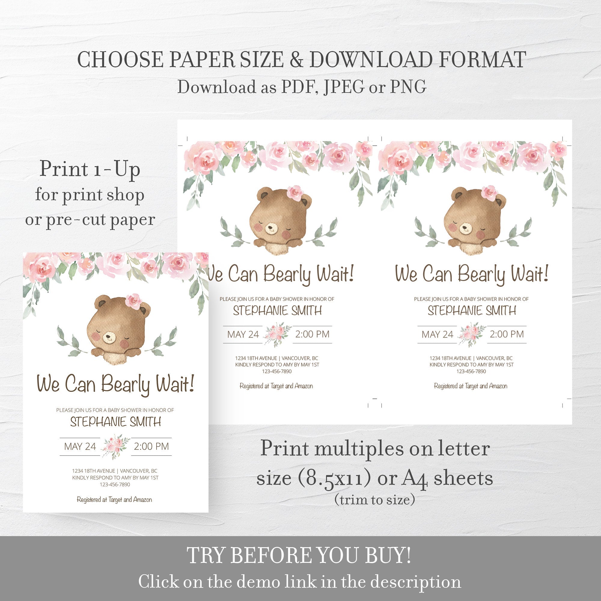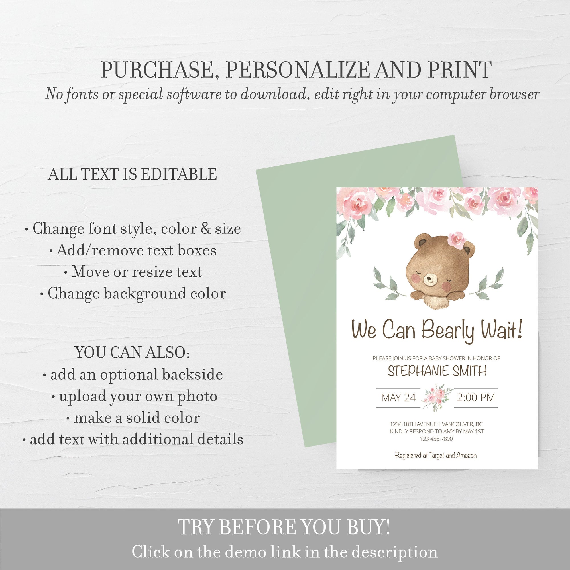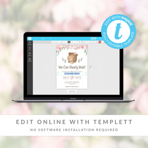 This teddy bear baby shower invitation is available as an INSTANT DOWNLOAD editable template. Edit right in your browser using the online program, Templett. No software to download or fonts to install and you can even try it out before you buy!