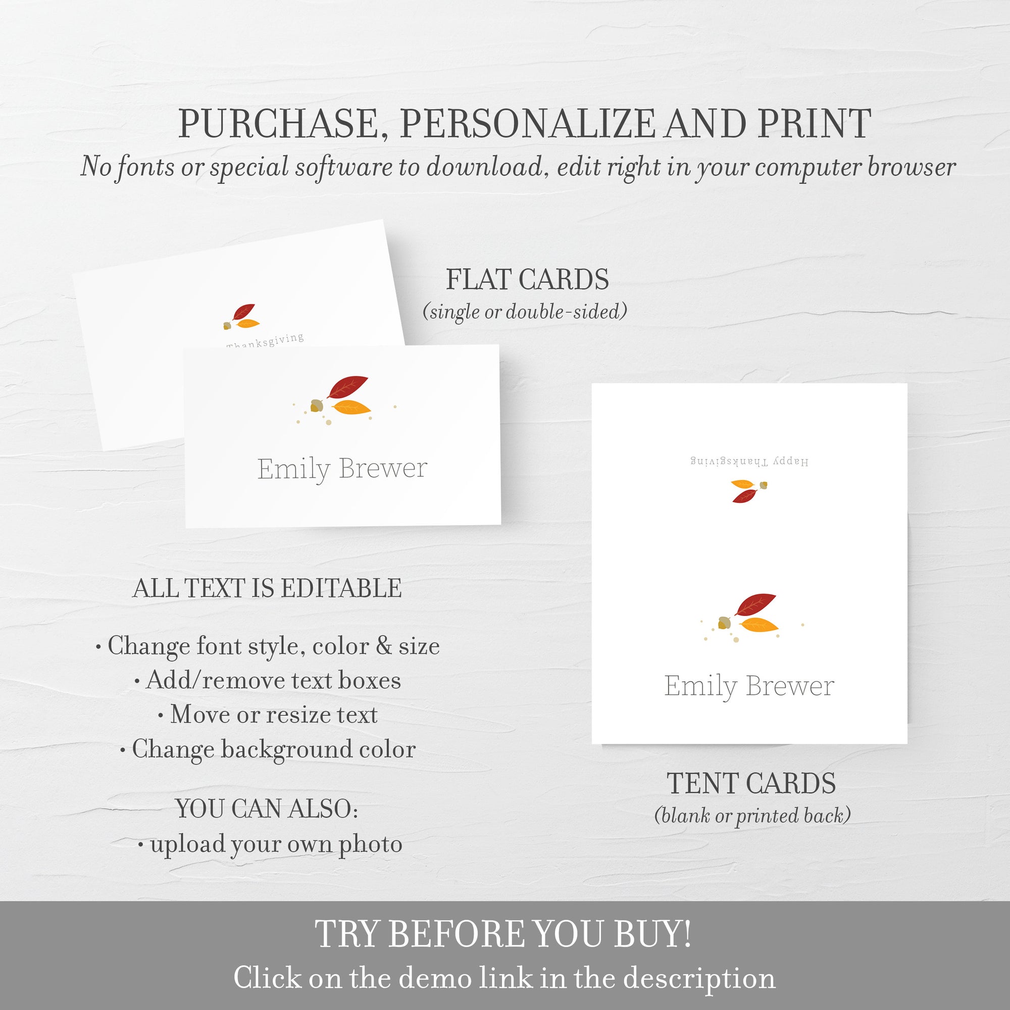 These fall leaves Thanksgiving place cards are available as an INSTANT DOWNLOAD editable template. Edit right in your browser using the online program, Templett. No software to download or fonts to install and you can even try it out before you buy!