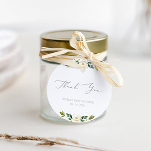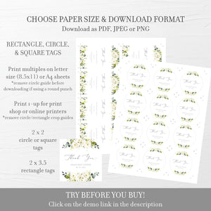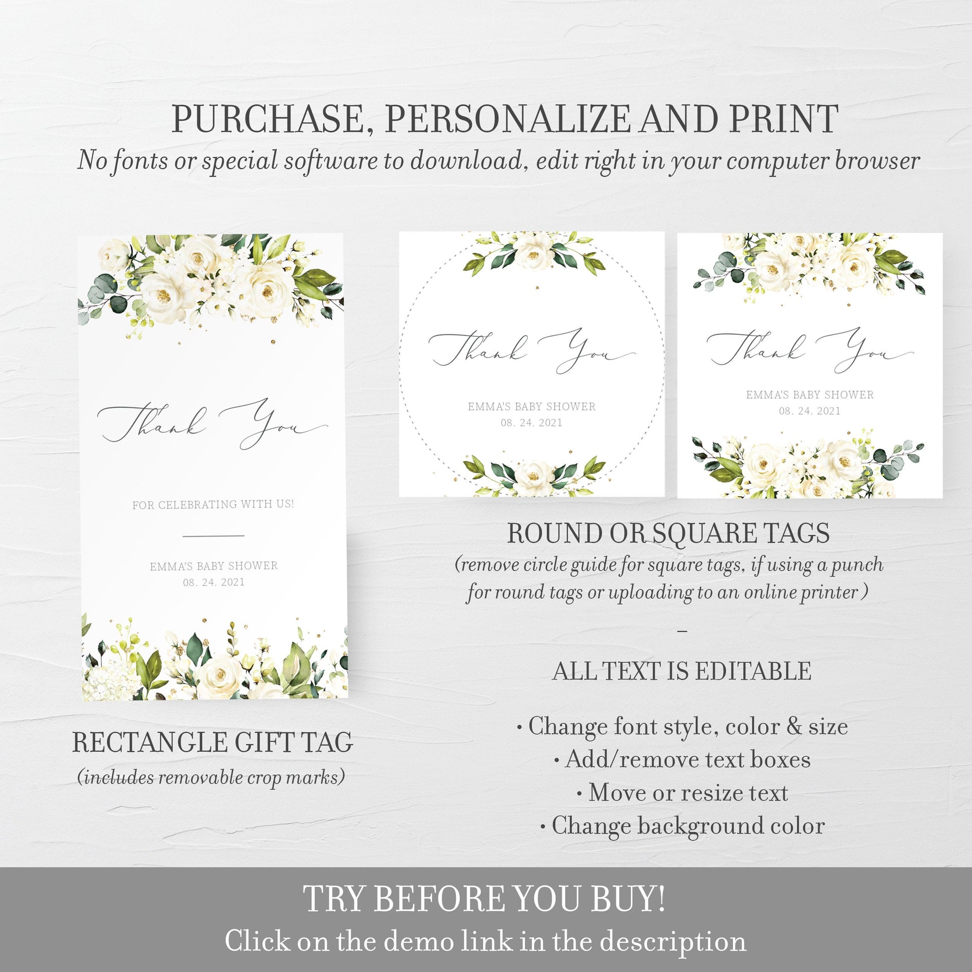 White Floral Greenery Baby Shower Favor Tags Template, Printable Thank You Tags, Editable INSTANT DOWNLOAD - WRG100