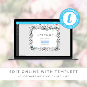 This winter wedding welcome sign is available as an INSTANT DOWNLOAD editable template. Edit right in your browser using the online program, Templett. No software to download or fonts to install and you can even try it out before you buy!