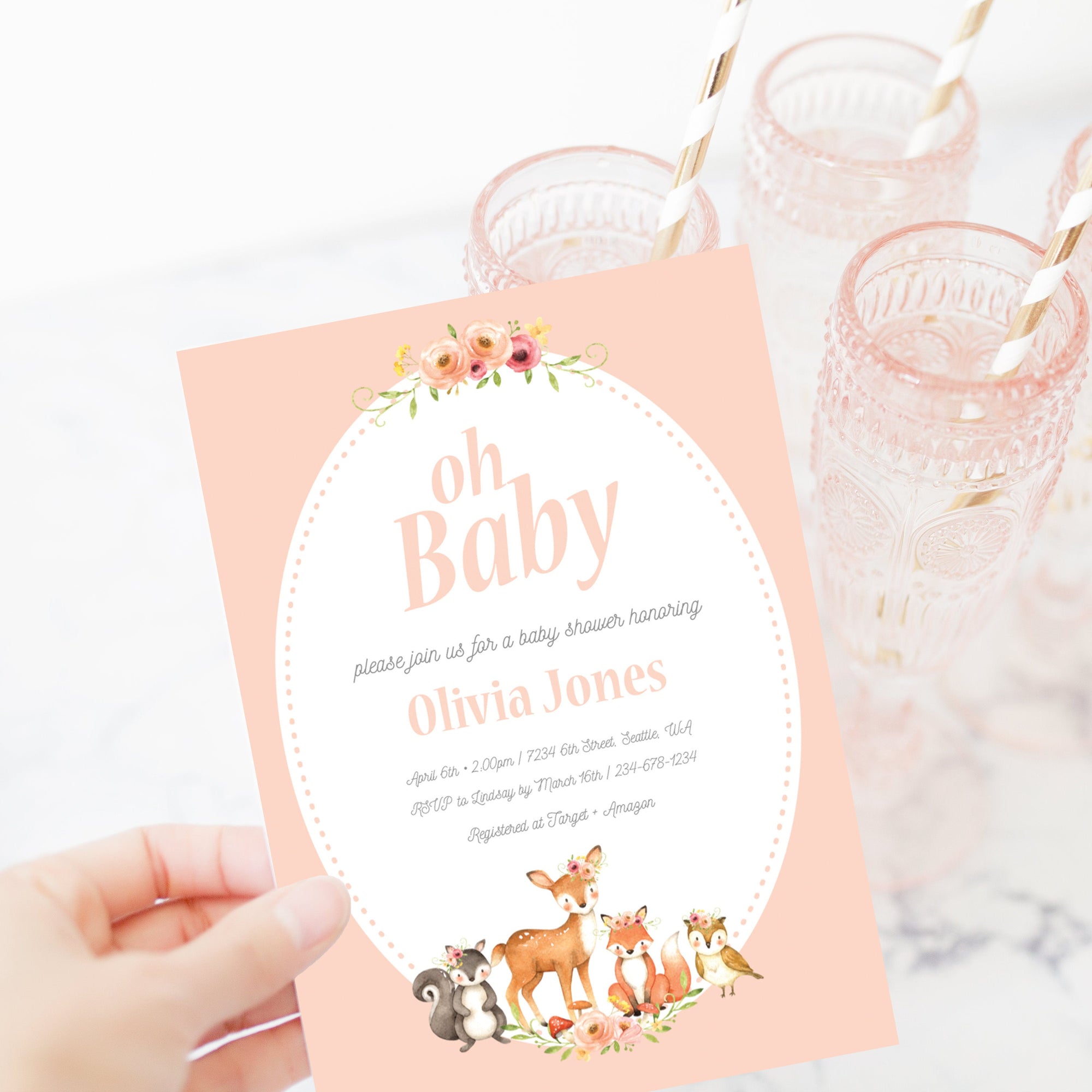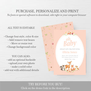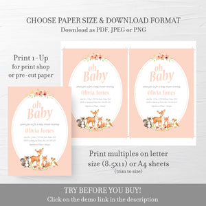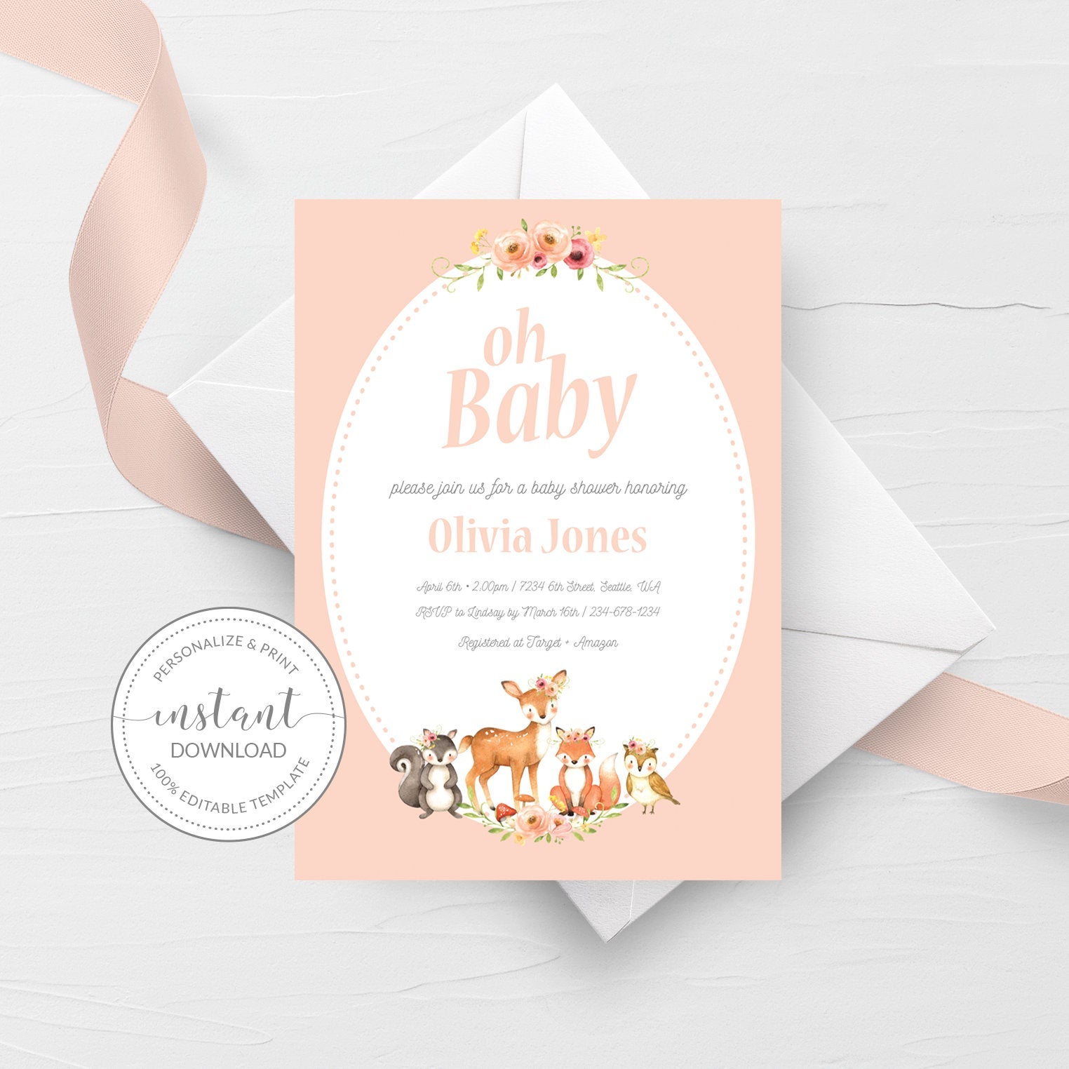 Woodland Animal Baby Shower Invitation Template, Printable Girl Baby Shower Invite, Editable INSTANT DOWNLOAD - W100