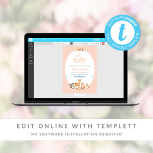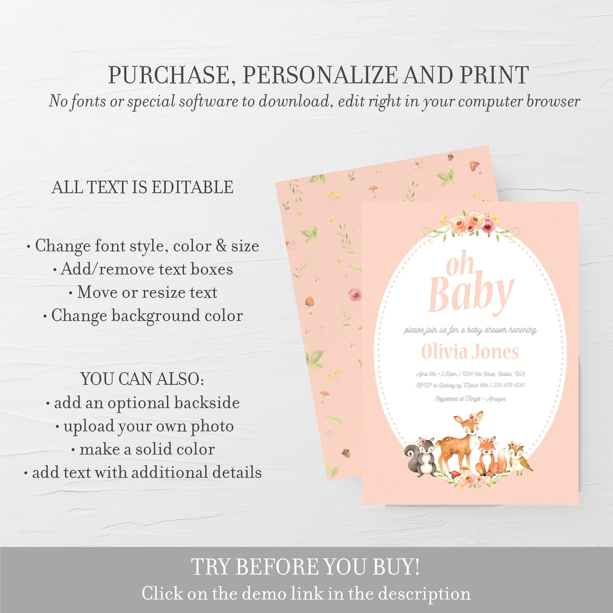 This woodland baby shower invitation is available as an INSTANT DOWNLOAD editable template. Edit right in your browser using the online program, Templett. No software to download or fonts to install and you can even try it out before you buy!